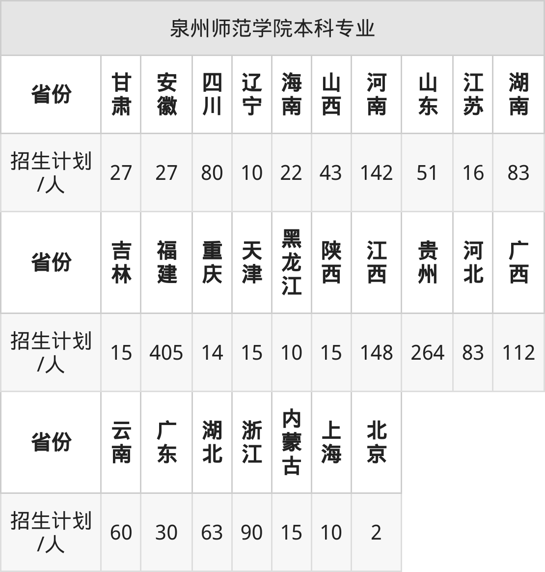 泉州师范学院面向江苏(16人)、湖北(63人)、贵州(264人)、河北(83人)、福建(405人)、河南(142人)、云南(60人)等27个地区开展本科招生。其中四川、陕西、河南、内蒙古招生批次为本科二批,其余省份为本科批。