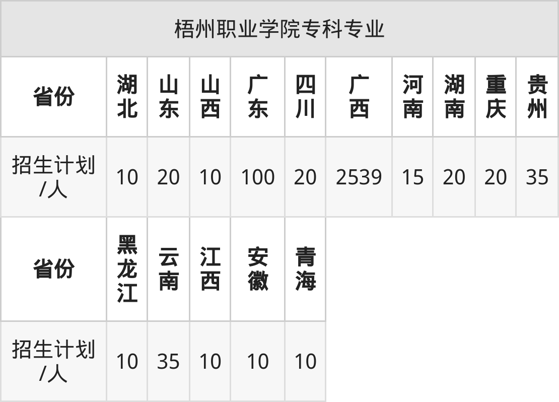 梧州职业学院面向广东(100人)、黑龙江(10人)、云南(35人)、湖南(20人)、山西(10人)、青海(10人)、湖北(10人)等15个地区开展专科招生。其中山东招生批次为二段,其余省份为专科批。