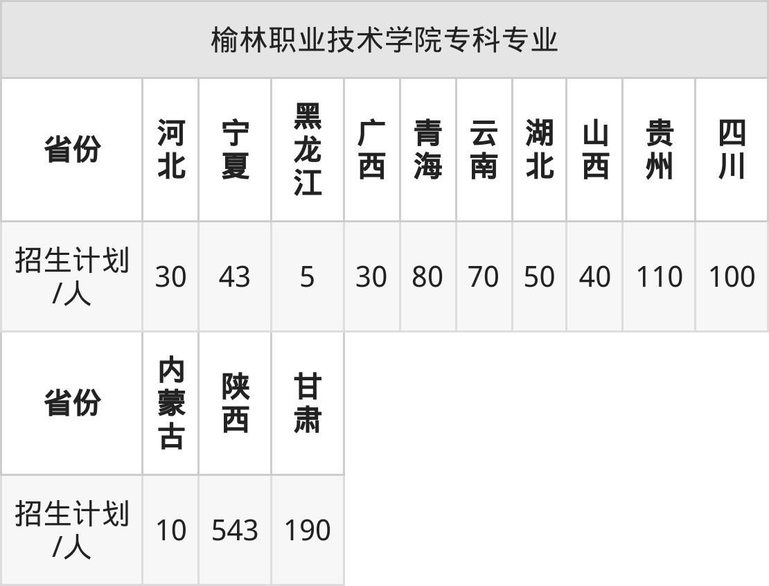 榆林职业技术学院面向湖北(50人)、河北(30人)、山西(40人)、四川(100人)、内蒙古(10人)、陕西(543人)、青海(80人)等13个地区开展专科招生。招生批次为专科批。