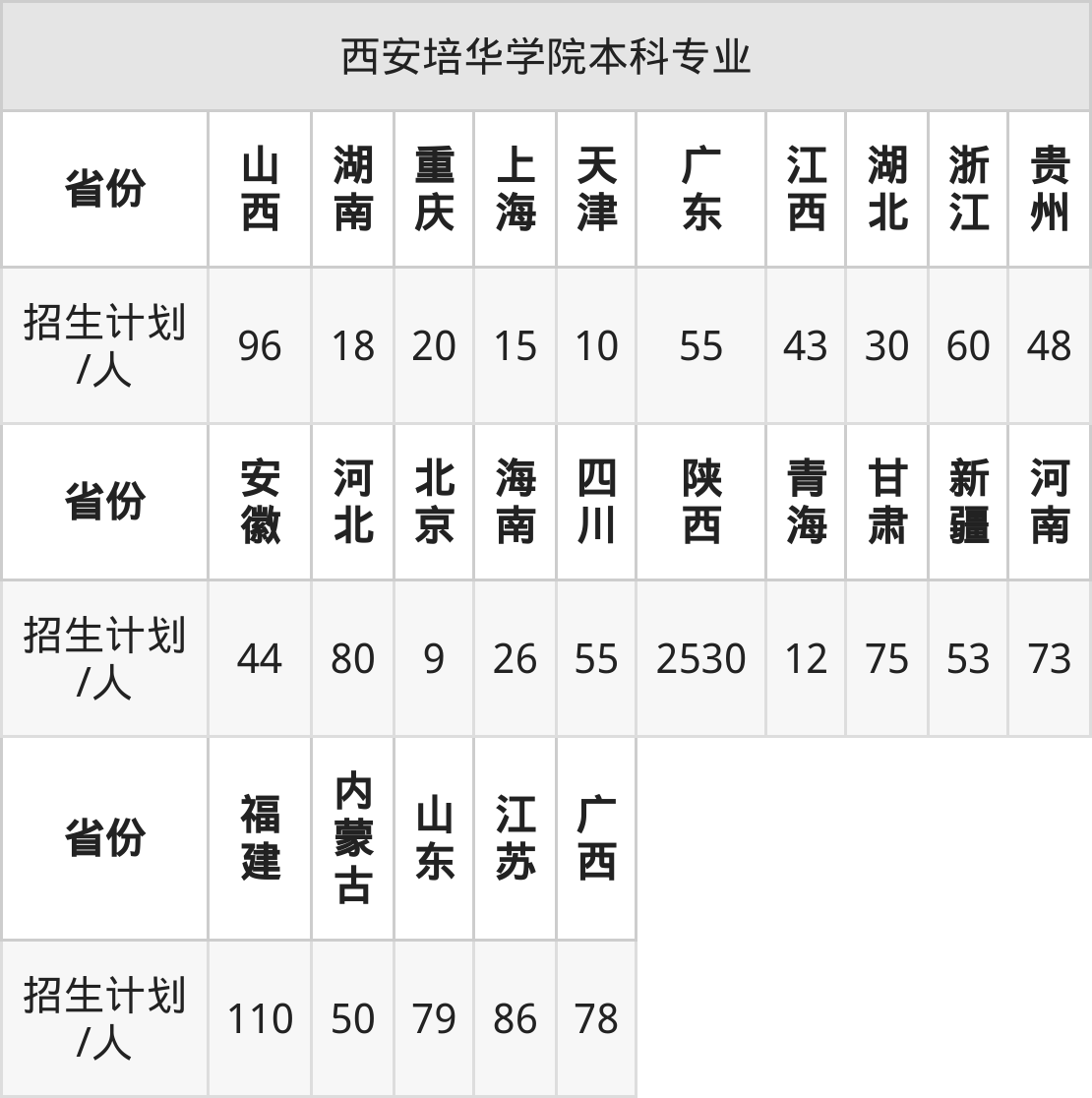 西安培华学院面向贵州(48人)、天津(10人)、广东(55人)、广西(78人)、陕西(2530人)、河南(73人)、湖北(30人)等25个地区开展本科招生。其中山东招生批次为一段,内蒙古、新疆、四川、陕西、河南招生批次为本科二批,其余省份为本科批。