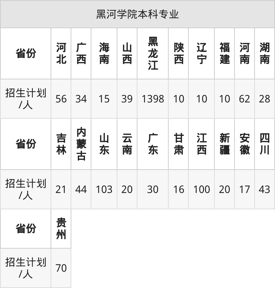 黑河学院面向江西(100人)、湖南(28人)、福建(10人)、广西(34人)、甘肃(16人)、河南(62人)、山东(103人)等21个地区开展本科招生。其中云南招生批次为二本,内蒙古、陕西、四川、新疆、河南招生批次为本科二批,其余省份为本科批。