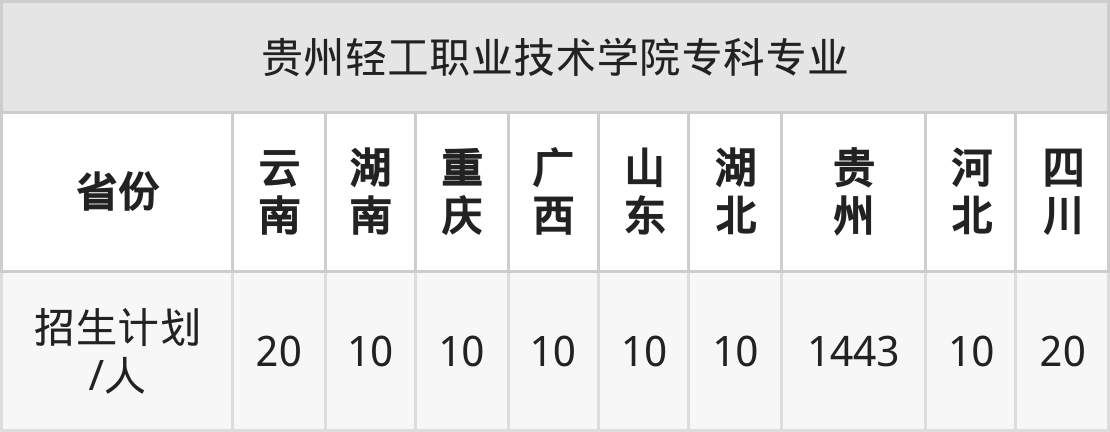 贵州轻工职业技术学院面向湖南(10人)、重庆(10人)、贵州(1443人)、河北(10人)、广西(10人)、云南(20人)、山东(10人)等9个地区开展专科招生。其中山东招生批次为二段,其余省份为专科批。