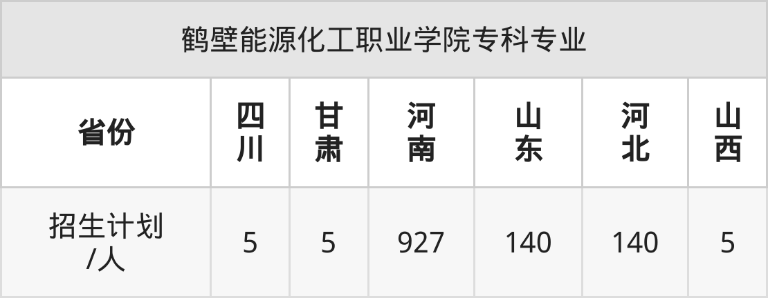 鹤壁能源化工职业学院面向甘肃(5人)、河南(927人)、山东(140人)、河北(140人)、山西(5人)、四川(5人)开展专科招生。其中山东招生批次为二段,其余省份为专科批。