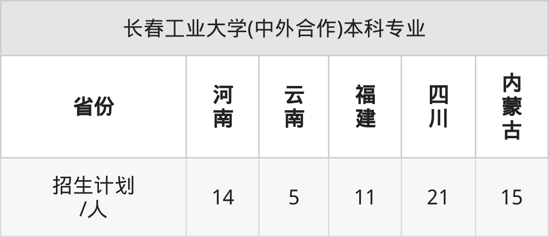 长春工业大学(中外合作)面向福建(11人)、四川(21人)、内蒙古(15人)、河南(14人)、云南(5人)开展本科招生。其中福建招生批次为本科批,其余省份为本科二批。