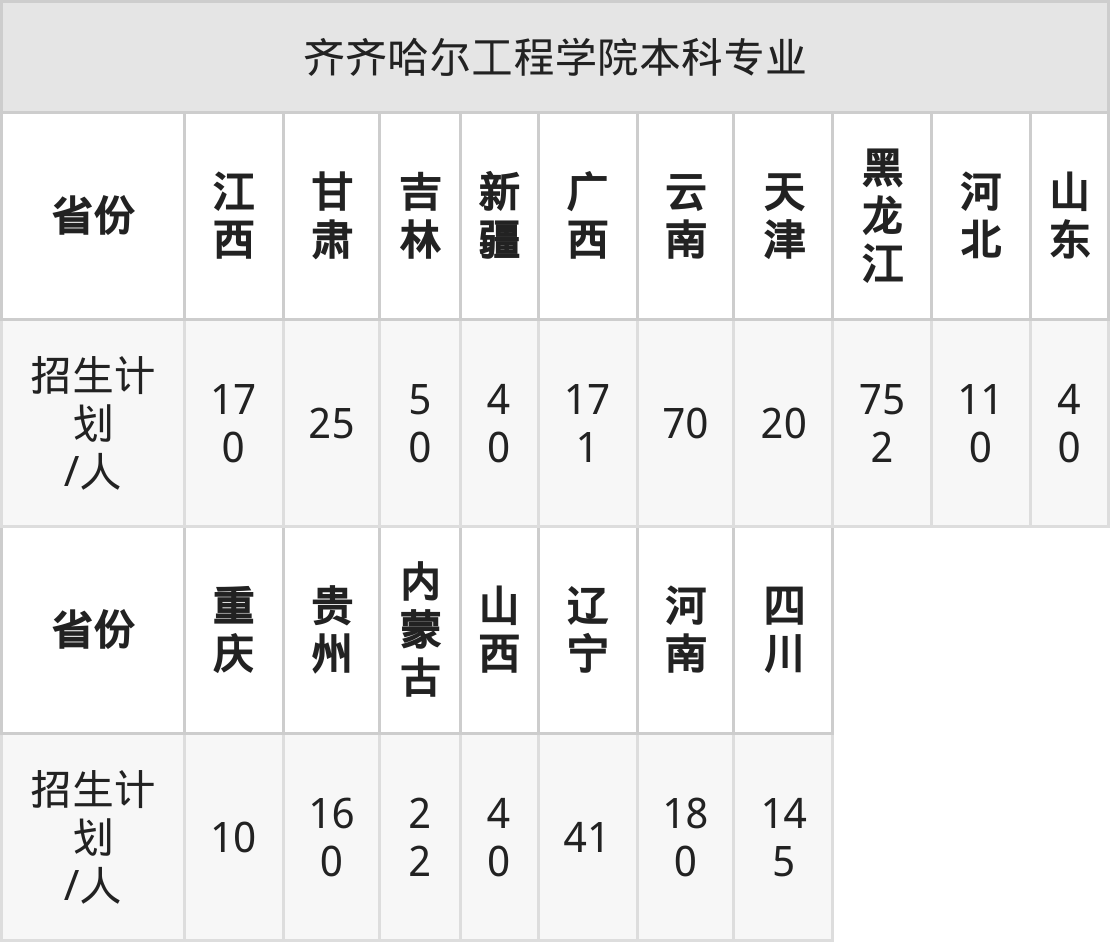 齐齐哈尔工程学院面向黑龙江(752人)、江西(170人)、山东(40人)、内蒙古(22人)、广西(171人)、云南(70人)、吉林(50人)等17个地区开展本科招生。其中山东招生批次为一段,内蒙古、四川、新疆、河南招生批次为本科二批,其余省份为本科批。