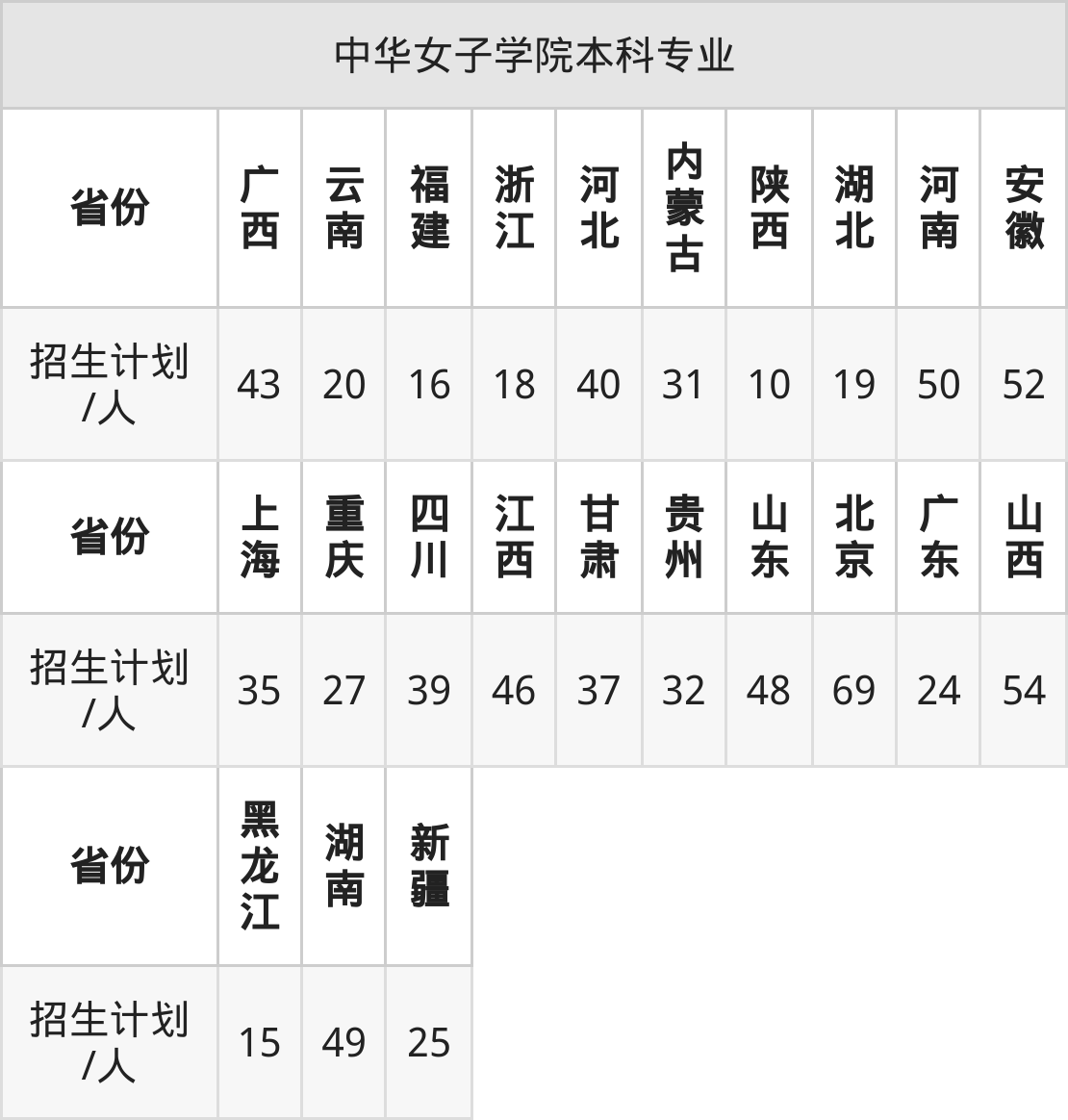 中华女子学院面向甘肃(37人)、河南(50人)、上海(35人)、浙江(18人)、新疆(25人)、黑龙江(15人)、湖北(19人)等23个地区开展本科招生。其中山东招生批次为一段,新疆、内蒙古、河南、四川、陕西招生批次为本科二批,其余省份为本科批。