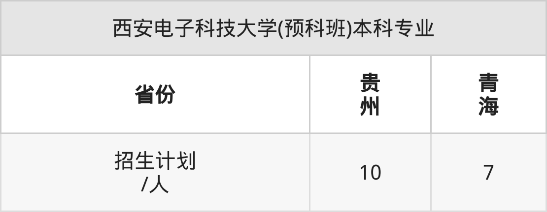 西安电子科技大学(预科班)面向青海(7人)、贵州(10人)开展本科招生。招生批次为本科批。