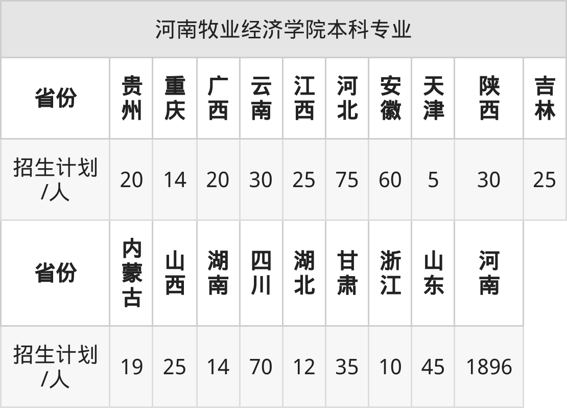河南牧业经济学院面向广西(20人)、江西(25人)、湖北(12人)、湖南(14人)、山西(25人)、天津(5人)、安徽(60人)等19个地区开展本科招生。其中天津招生批次为本科批A段,内蒙古、陕西、四川、河南招生批次为本科二批,其余省份为本科批。