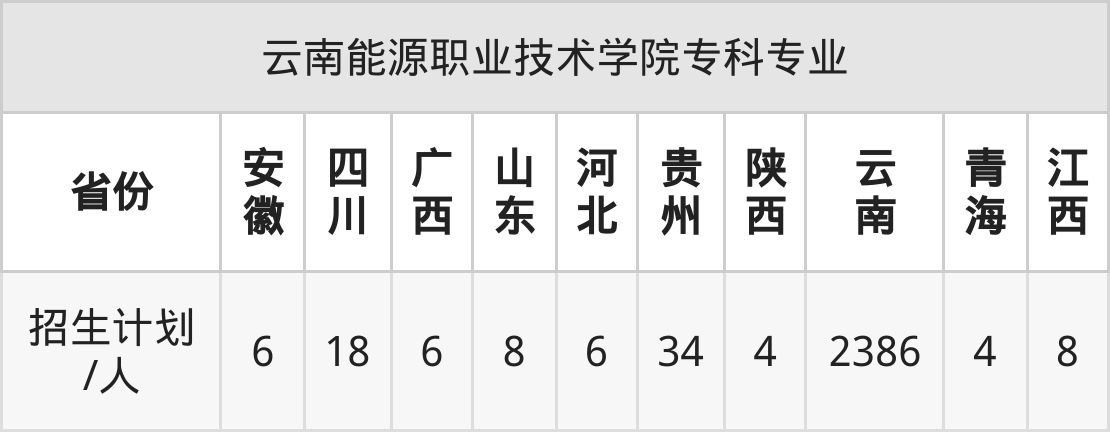 云南能源职业技术学院面向安徽(6人)、四川(18人)、云南(2386人)、青海(4人)、江西(8人)、山东(8人)、贵州(34人)等10个地区开展专科招生。其中山东招生批次为二段,其余省份为专科批。