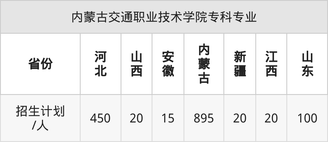 内蒙古交通职业技术学院面向山西(20人)、安徽(15人)、内蒙古(895人)、新疆(20人)、江西(20人)、山东(100人)、河北(450人)等7个地区开展专科招生。其中山东招生批次为二段,其余省份为专科批。