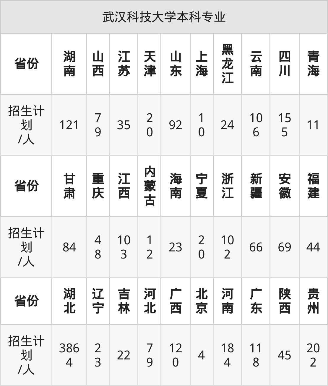武汉科技大学面向湖北(3864人)、吉林(22人)、宁夏(20人)、黑龙江(24人)、上海(10人)、贵州(202人)、河北(79人)等30个地区开展本科招生。其中青海招生批次为本科一段,四川、内蒙古、河南、陕西、新疆招生批次为本科一批,其余省份为本科批。