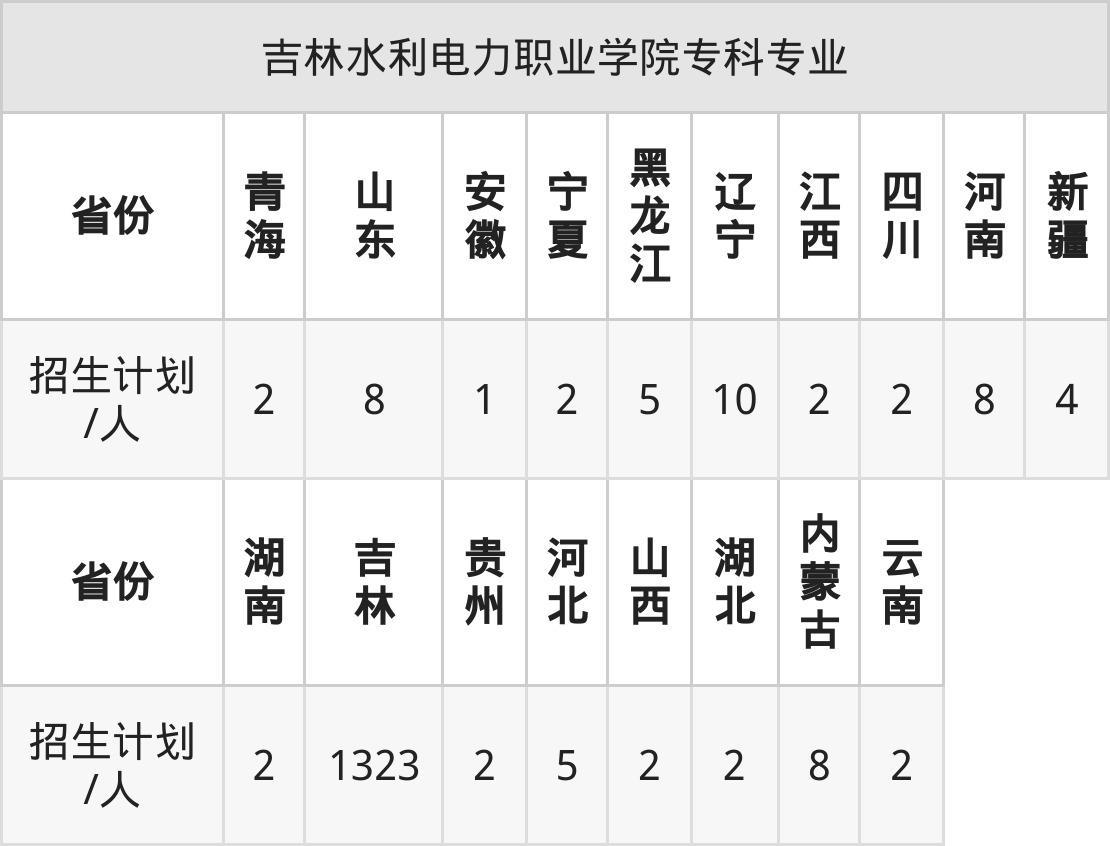 吉林水利电力职业学院面向黑龙江(5人)、河南(8人)、青海(2人)、四川(2人)、宁夏(2人)、内蒙古(8人)、湖北(2人)等18个地区开展专科招生。其中山东招生批次为二段,其余省份为专科批。