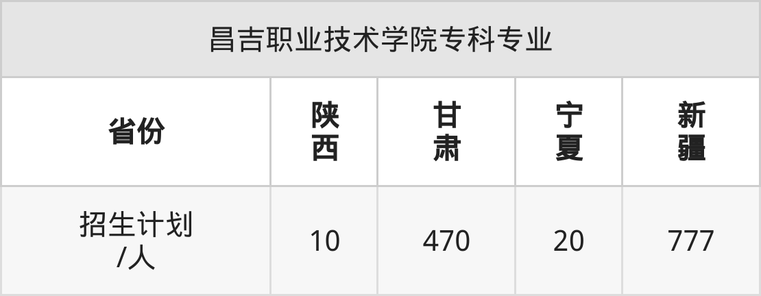 昌吉职业技术学院面向陕西(10人)、甘肃(470人)、宁夏(20人)、新疆(777人)开展专科招生。招生批次为专科批。