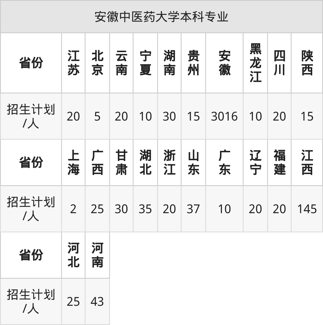 安徽中医药大学面向河北(25人)、浙江(20人)、福建(20人)、广东(10人)、甘肃(30人)、上海(2人)、北京(5人)等22个地区开展本科招生。其中宁夏招生批次为第二批本科,陕西、河南、四川招生批次为本科二批,其余省份为本科批。