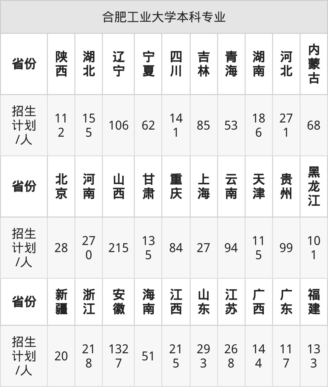 合肥工业大学面向四川(141人)、内蒙古(68人)、青海(53人)、湖北(155人)、江西(215人)、新疆(20人)、河南(270人)等30个地区开展本科招生。其中陕西、新疆、内蒙古、四川、河南招生批次为本科一批,其余省份为本科批。