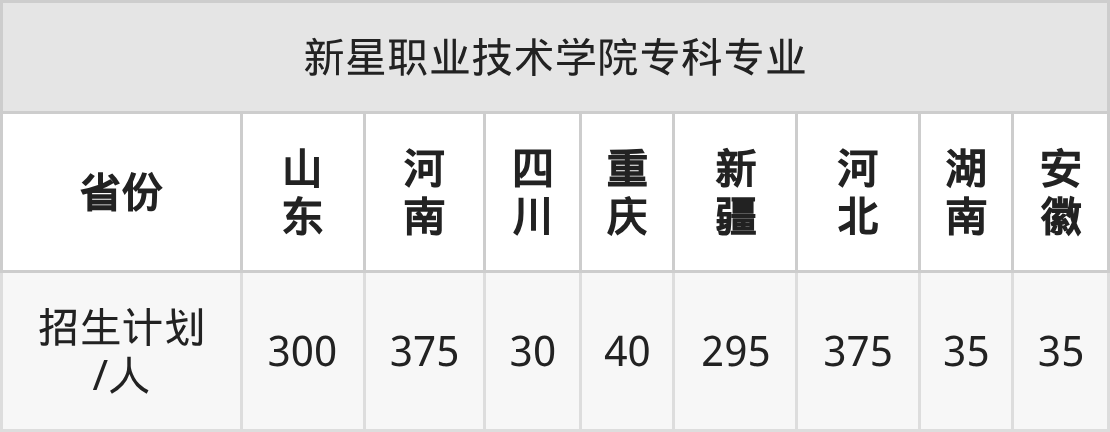 新星职业技术学院面向重庆(40人)、新疆(295人)、山东(300人)、河南(375人)、湖南(35人)、河北(375人)、安徽(35人)等8个地区开展专科招生。其中山东招生批次为二段,其余省份为专科批。
