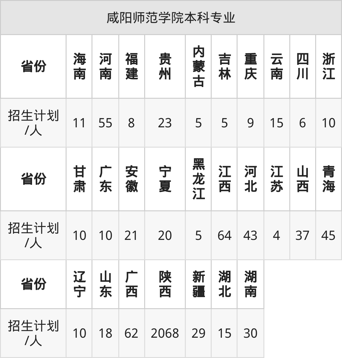 咸阳师范学院面向海南(11人)、宁夏(20人)、青海(45人)、山西(37人)、贵州(23人)、福建(8人)、广东(10人)等27个地区开展本科招生。其中四川、河南、新疆、陕西、内蒙古招生批次为本科二批,其余省份为本科批。