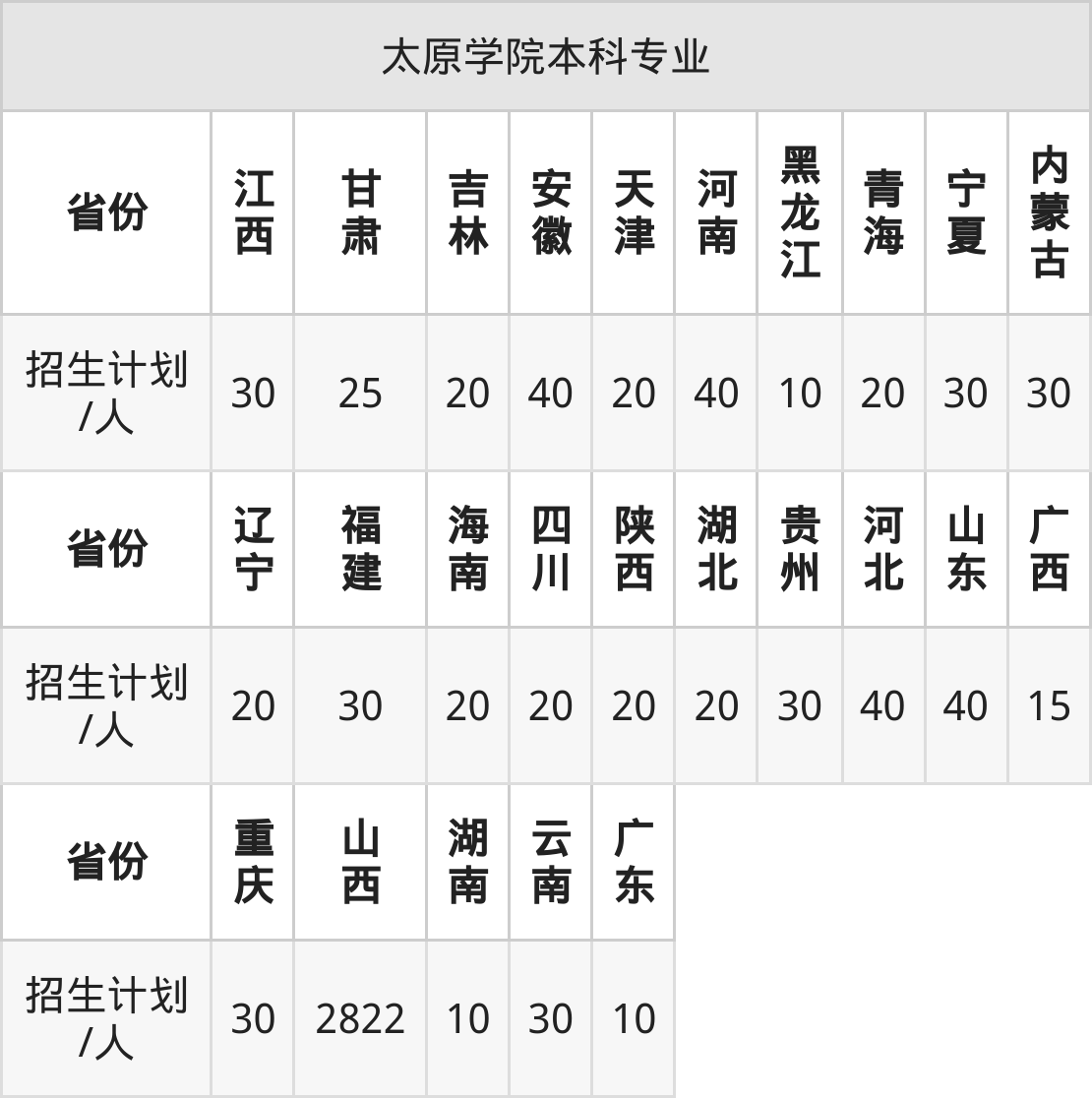 太原学院面向河北(40人)、福建(30人)、天津(20人)、宁夏(30人)、内蒙古(30人)、江西(30人)、山西(2822人)等25个地区开展本科招生。其中云南招生批次为二本,内蒙古、河南、四川、陕西招生批次为本科二批,其余省份为本科批。