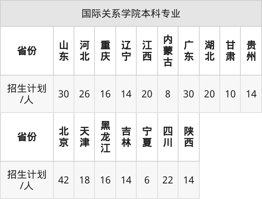 国际关系学院面向湖北(20人)、贵州(14人)、天津(18人)、内蒙古(8人)、吉林(14人)、江西(20人)、重庆(16人)等17个地区开展本科招生。其中河北、重庆、贵州、天津、甘肃、北京、内蒙古、吉林招生批次为本科提前批A,其余省份为本科提前批。