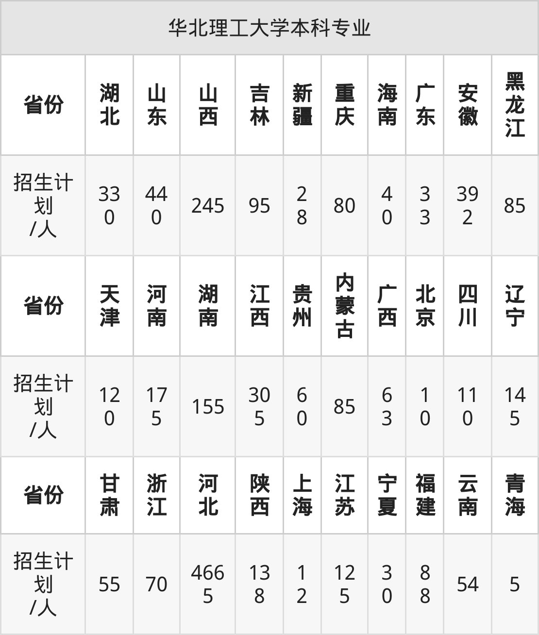 华北理工大学面向福建(88人)、广东(33人)、甘肃(55人)、新疆(28人)、上海(12人)、江苏(125人)、青海(5人)等30个地区开展本科招生。其中山西招生批次为第一批本科B类,新疆、陕西招生批次为本科二批,四川、内蒙古、河南招生批次为本科一批,其余省份为本科批。