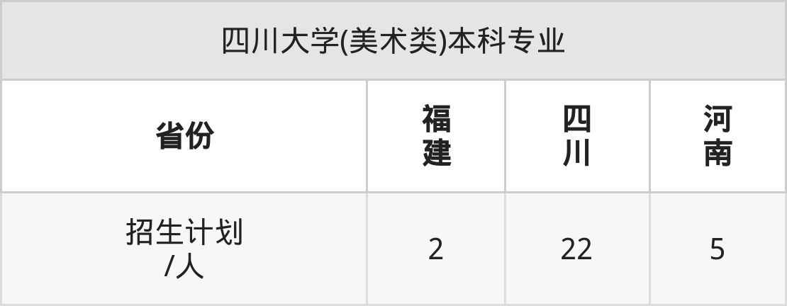 四川大学(美术类)面向福建(2人)、四川(22人)、河南(5人)开展本科招生。其中福建招生批次为本科批,其余省份为本科一批。