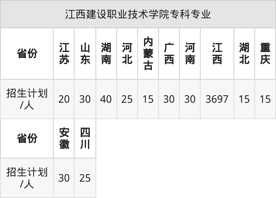 江西建设职业技术学院面向江苏(20人)、河南(30人)、湖北(15人)、湖南(40人)、河北(25人)、安徽(30人)、内蒙古(15人)等12个地区开展专科招生。其中山东招生批次为二段,其余省份为专科批。