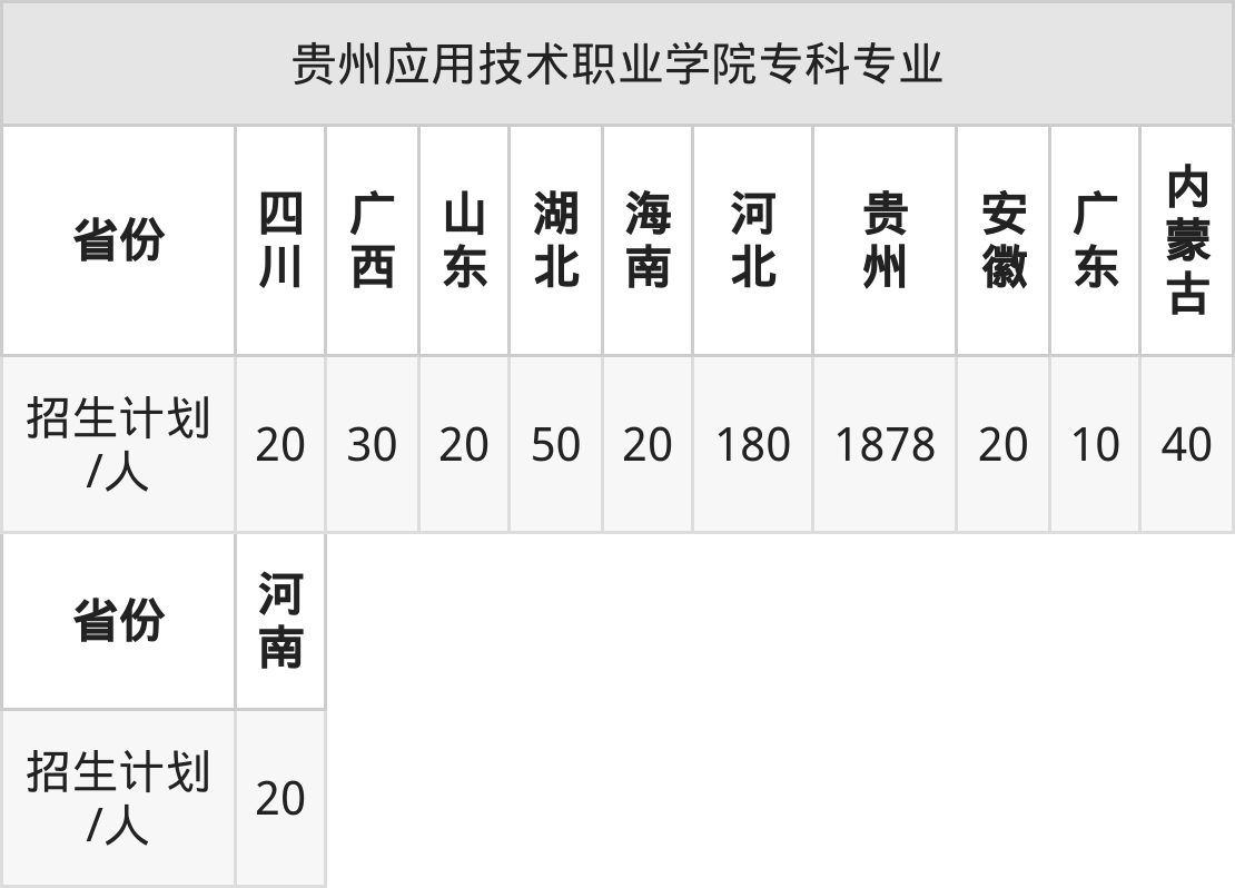 贵州应用技术职业学院面向内蒙古(40人)、广西(30人)、山东(20人)、湖北(50人)、海南(20人)、河北(180人)、贵州(1878人)等11个地区开展专科招生。其中山东招生批次为二段,其余省份为专科批。