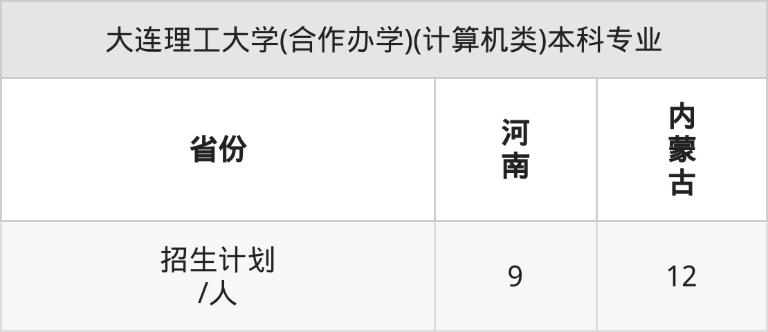 大连理工大学(合作办学)(计算机类)面向内蒙古(12人)、河南(9人)开展本科招生。招生批次为本科一批。