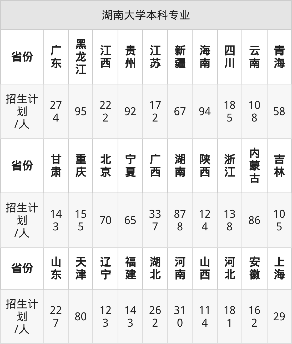 湖南大学面向云南(108人)、青海(58人)、江西(222人)、海南(94人)、广西(337人)、陕西(124人)、甘肃(143人)等30个地区开展本科招生。其中云南招生批次为一本,内蒙古、陕西、新疆、河南、四川招生批次为本科一批,其余省份为本科批。