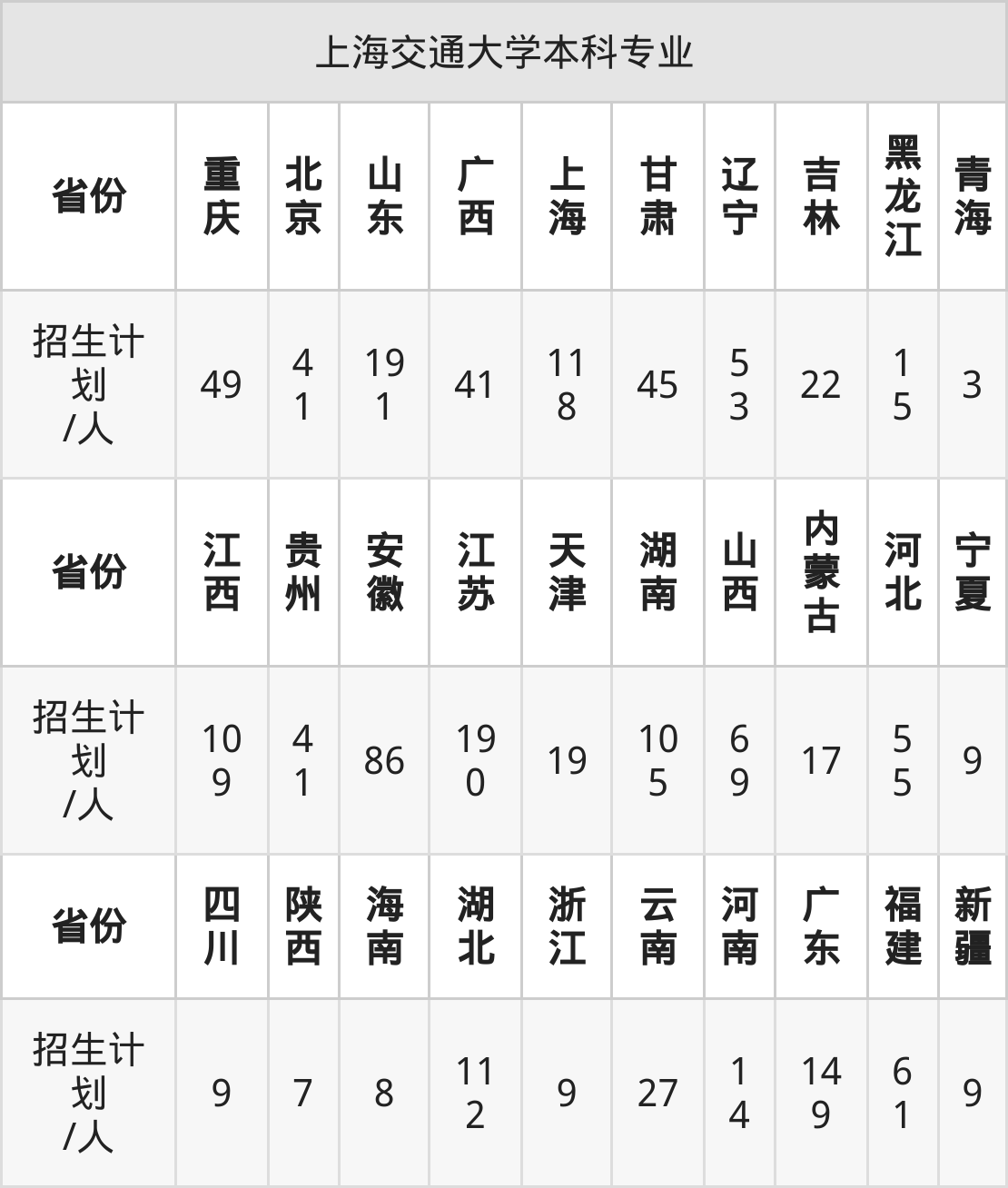 上海交通大学面向贵州(41人)、河北(55人)、甘肃(45人)、吉林(22人)、江西(109人)、天津(19人)、安徽(86人)等30个地区开展本科招生。其中宁夏招生批次为第一批本科,陕西、新疆、四川、内蒙古、河南招生批次为本科一批,其余省份为本科批。