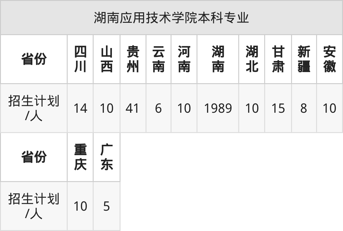 湖南应用技术学院面向贵州(41人)、广东(5人)、新疆(8人)、甘肃(15人)、河南(10人)、云南(6人)、山西(10人)等12个地区开展本科招生。其中云南招生批次为二本,四川、新疆、河南招生批次为本科二批,其余省份为本科批。