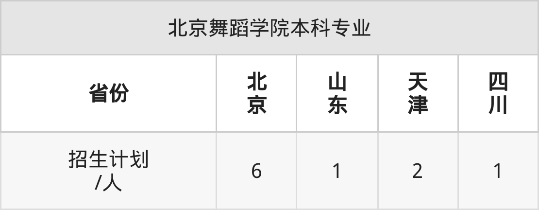 北京舞蹈学院面向山东(1人)、天津(2人)、四川(1人)、北京(6人)开展本科招生。招生批次为本科一批。