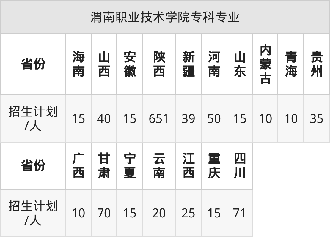 渭南职业技术学院面向内蒙古(10人)、山东(15人)、重庆(15人)、贵州(35人)、青海(10人)、山西(40人)、四川(71人)等17个地区开展专科招生。其中山东招生批次为二段,其余省份为专科批。