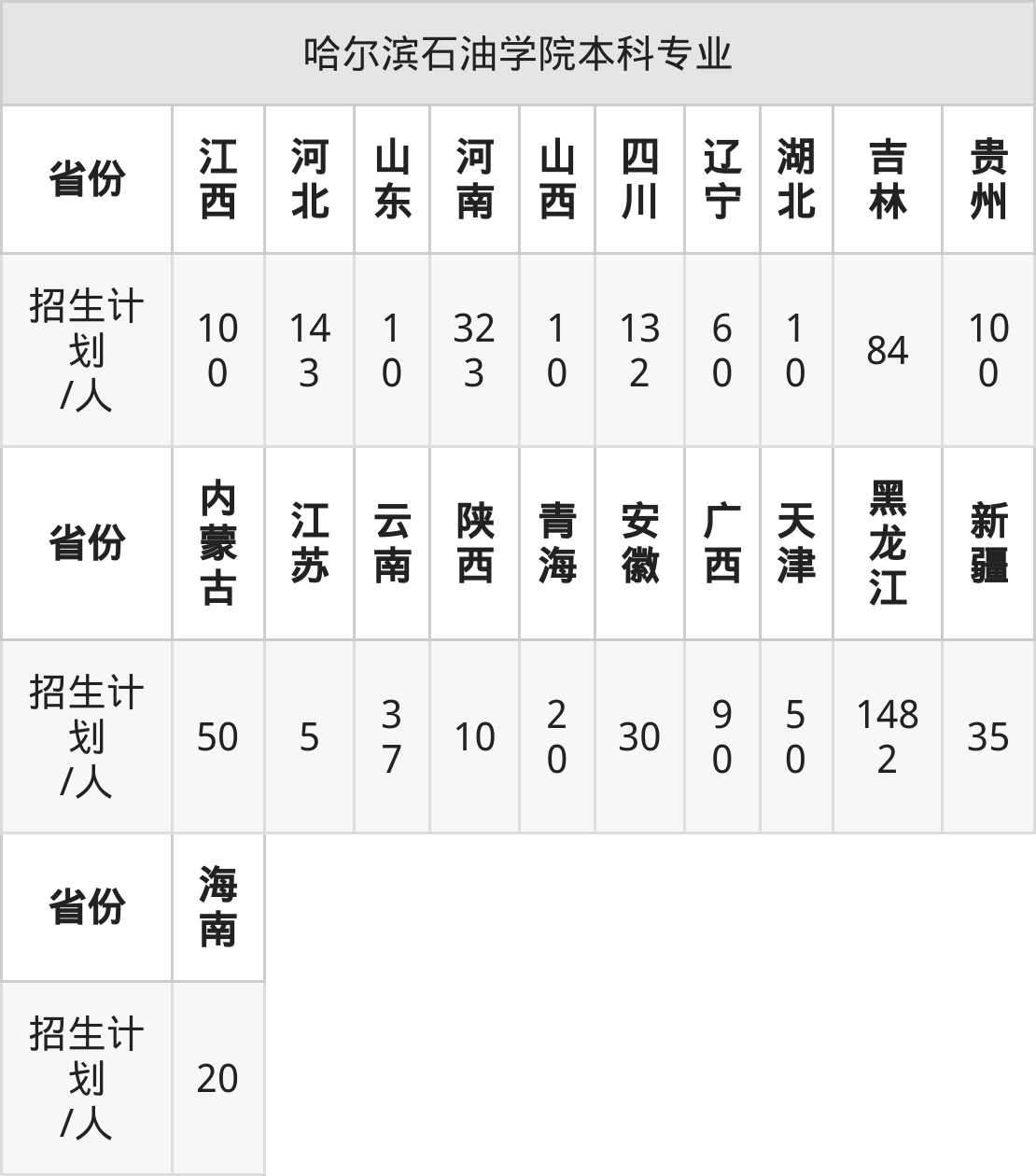 哈尔滨石油学院面向江苏(5人)、云南(37人)、海南(20人)、江西(100人)、山东(10人)、贵州(100人)、安徽(30人)等21个地区开展本科招生。其中山东招生批次为一段,四川、内蒙古、陕西、河南、新疆招生批次为本科二批,其余省份为本科批。
