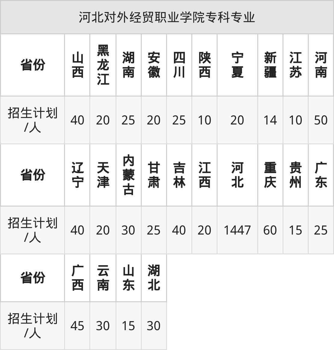 河北对外经贸职业学院面向新疆(14人)、河南(50人)、云南(30人)、山东(15人)、湖北(30人)、陕西(10人)、甘肃(25人)等24个地区开展专科招生。其中山东招生批次为二段,其余省份为专科批。