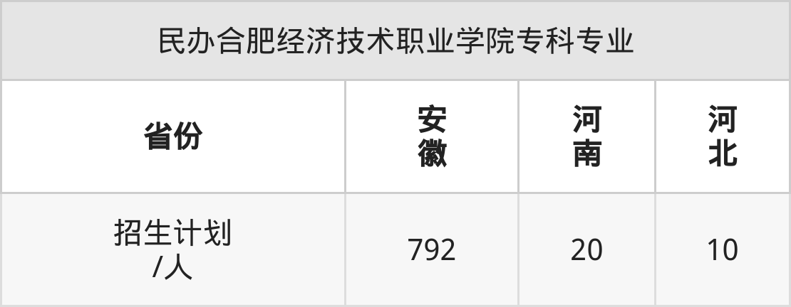 民办合肥经济技术职业学院面向安徽(792人)、河南(20人)、河北(10人)开展专科招生。招生批次为专科批。