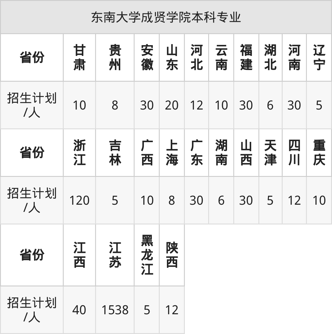 东南大学成贤学院面向江西(40人)、浙江(120人)、云南(10人)、黑龙江(5人)、辽宁(5人)、湖南(6人)、贵州(8人)等24个地区开展本科招生。其中云南招生批次为二本,四川、陕西、河南招生批次为本科二批,其余省份为本科批。