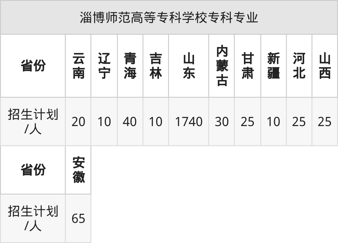 淄博师范高等专科学校面向甘肃(25人)、新疆(10人)、青海(40人)、吉林(10人)、河北(25人)、安徽(65人)、内蒙古(30人)等11个地区开展专科招生。其中山东招生批次为二段,其余省份为专科批。