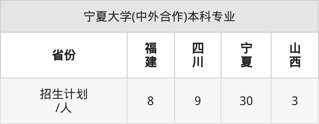宁夏大学(中外合作)面向宁夏(30人)、山西(3人)、福建(8人)、四川(9人)开展本科招生。招生批次为第一批本科A1类。