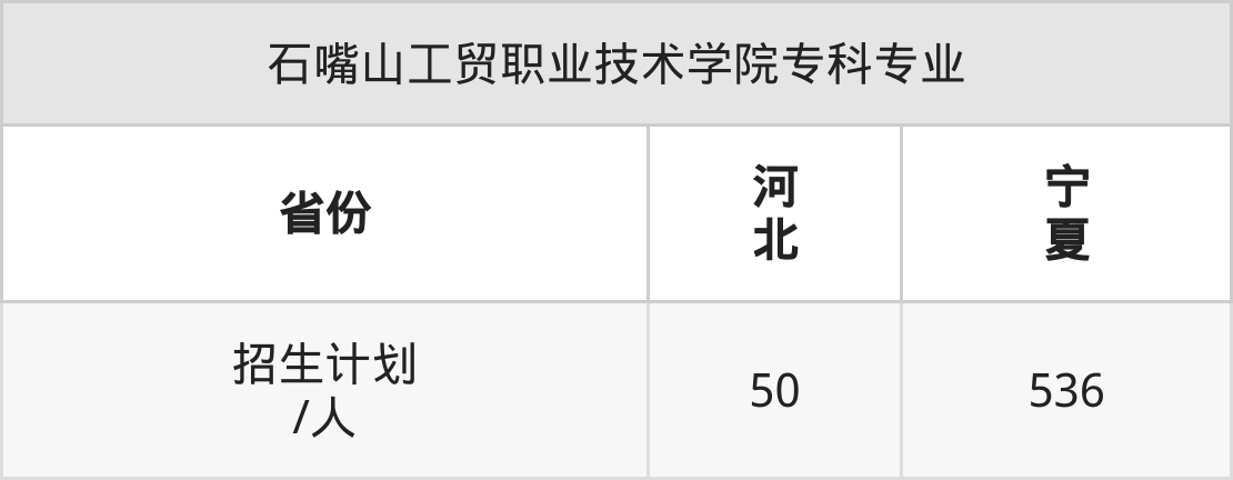 石嘴山工贸职业技术学院面向河北(50人)、宁夏(536人)开展专科招生。招生批次为专科批。
