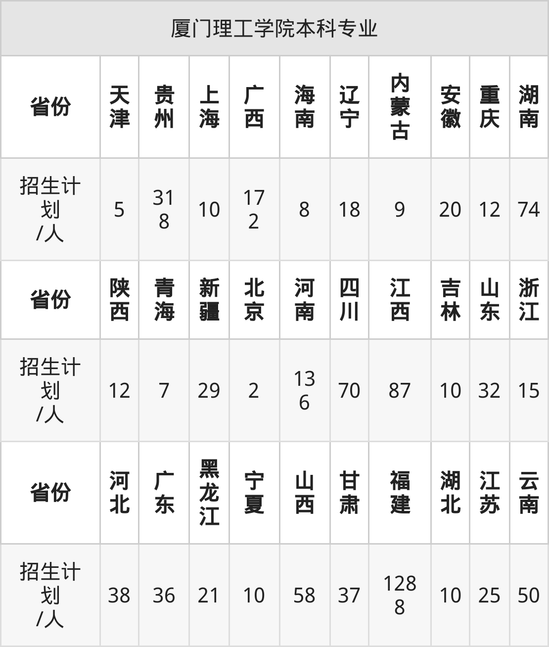 厦门理工学院面向福建(1288人)、广东(36人)、四川(70人)、湖北(10人)、海南(8人)、河北(38人)、宁夏(10人)等30个地区开展本科招生。其中云南招生批次为二本,新疆、内蒙古、河南、四川、陕西招生批次为本科二批,其余省份为本科批。