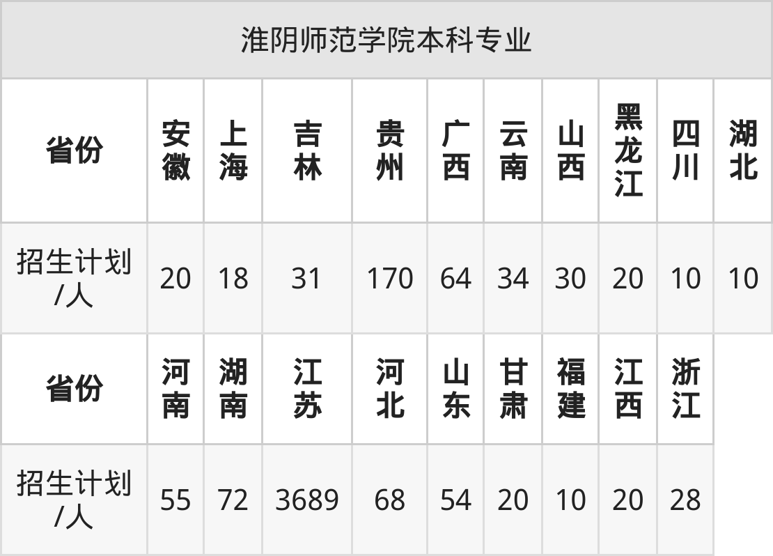 淮阴师范学院面向河北(68人)、浙江(28人)、福建(10人)、四川(10人)、江西(20人)、贵州(170人)、广西(64人)等19个地区开展本科招生。其中四川、河南招生批次为本科二批,其余省份为本科批。