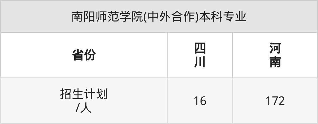 南阳师范学院(中外合作)面向四川(16人)、河南(172人)开展本科招生。招生批次为本科二批。