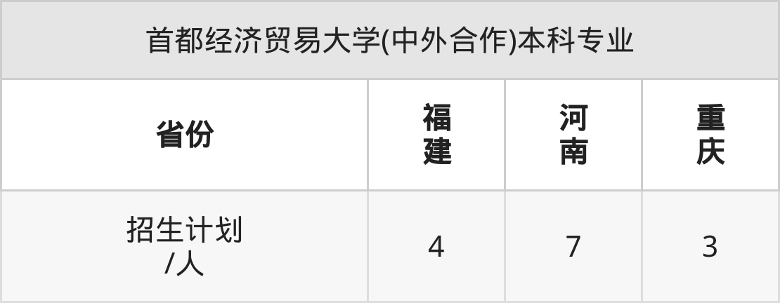 首都经济贸易大学(中外合作)面向重庆(3人)、福建(4人)、河南(7人)开展本科招生。其中河南招生批次为本科一批,其余省份为本科批。