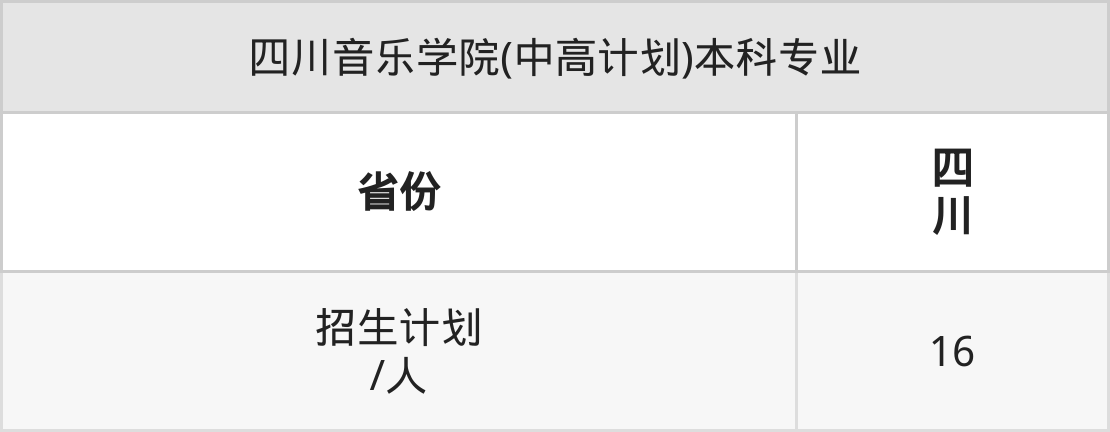 四川音乐学院(中高计划)面向四川(16人)开展本科招生。招生批次为本科二批。