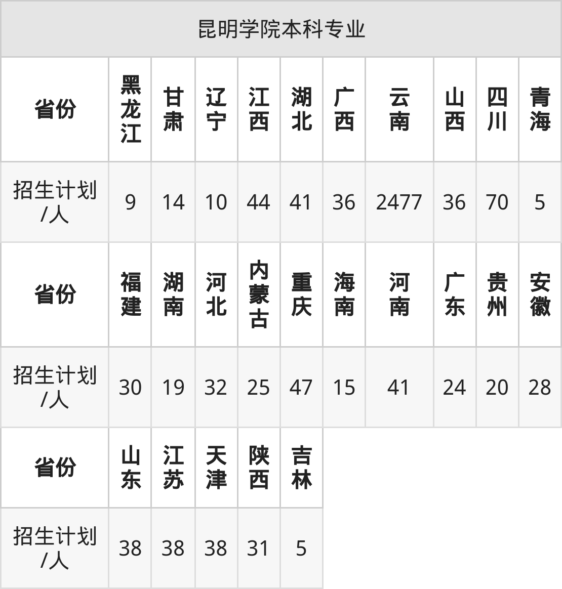 昆明学院面向广东(24人)、陕西(31人)、内蒙古(25人)、黑龙江(9人)、江苏(38人)、云南(2477人)、安徽(28人)等25个地区开展本科招生。其中云南招生批次为二本,陕西、内蒙古、四川、河南招生批次为本科二批,其余省份为本科批。