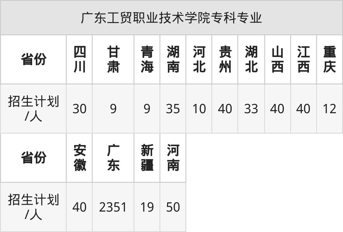 广东工贸职业技术学院面向河北(10人)、重庆(12人)、四川(30人)、甘肃(9人)、青海(9人)、广东(2351人)、湖北(33人)等14个地区开展专科招生。招生批次为专科批。