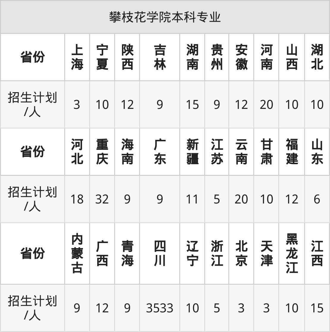 攀枝花学院面向山东(6人)、湖南(15人)、吉林(9人)、海南(9人)、河南(20人)、青海(9人)、重庆(32人)等30个地区开展本科招生。其中天津招生批次为本科批A段,新疆、河南、陕西、内蒙古、四川招生批次为本科二批,其余省份为本科批。