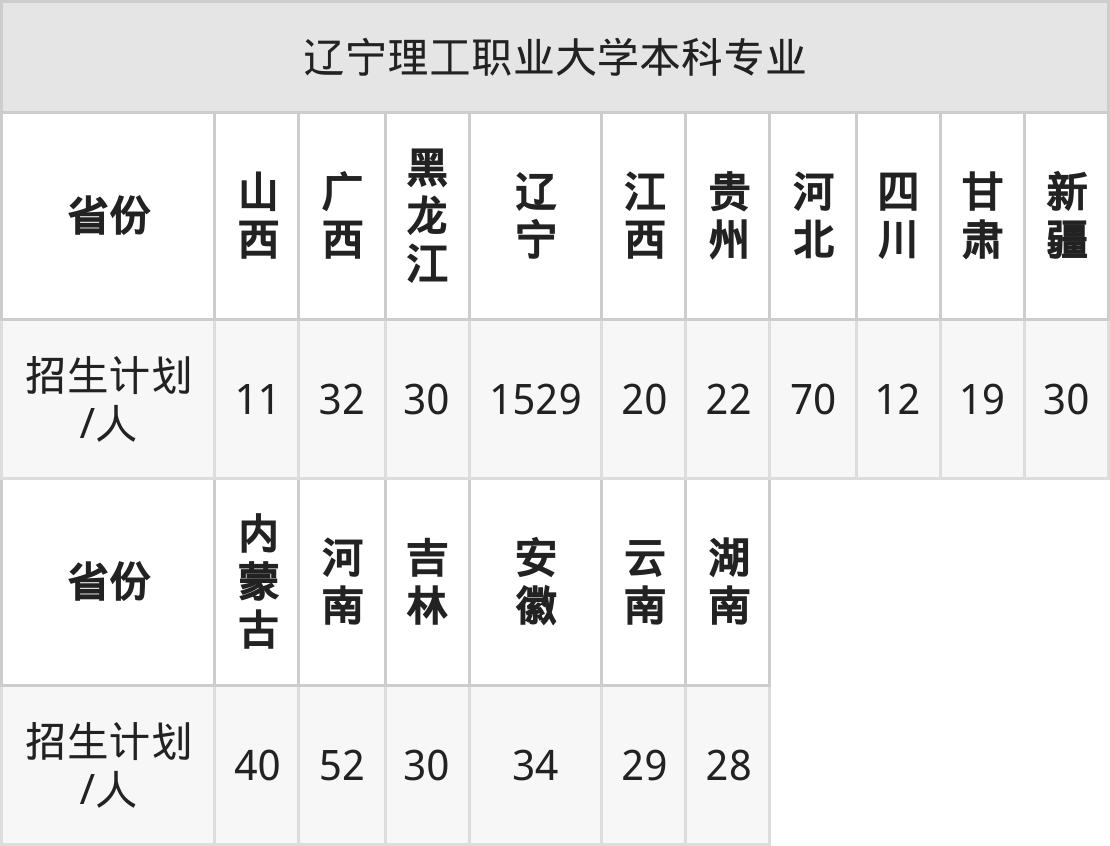 辽宁理工职业大学面向安徽(34人)、广西(32人)、新疆(30人)、江西(20人)、黑龙江(30人)、辽宁(1529人)、贵州(22人)等16个地区开展本科招生。其中云南招生批次为二本,新疆、内蒙古、四川、河南招生批次为本科二批,其余省份为本科批。