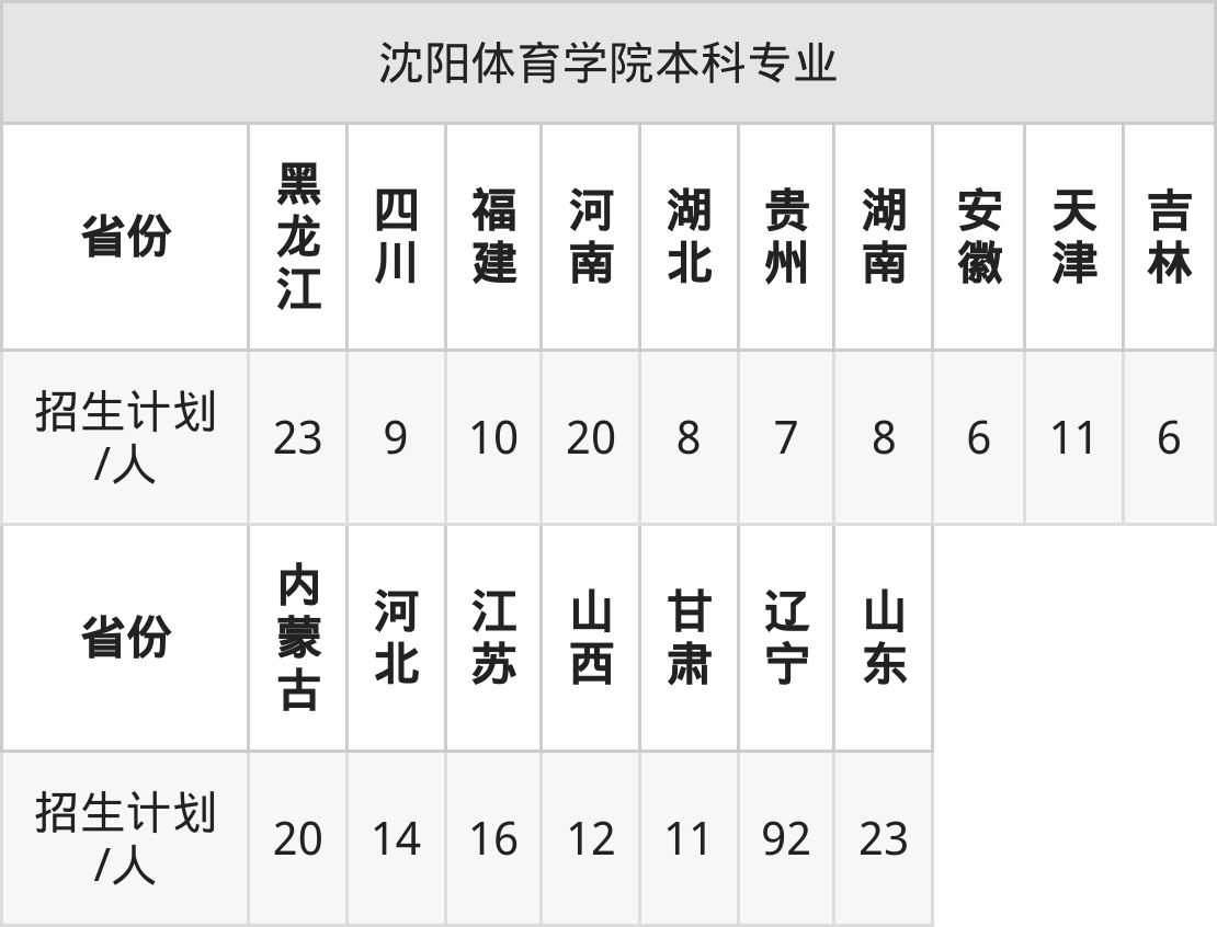 沈阳体育学院面向福建(10人)、湖南(8人)、江苏(16人)、吉林(6人)、湖北(8人)、贵州(7人)、天津(11人)等17个地区开展本科招生。其中山东招生批次为一段,内蒙古、河南、四川招生批次为本科二批,其余省份为本科批。